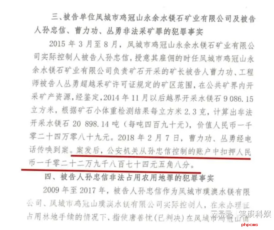 2017年12月,孙忠信第一次被抓。2019年8月,丹东市元宝区法院对孙忠信判决三个罪名,分别是:非法采矿罪,判处有期徒刑四年,并处罚金人民币五十万元;非法处置查封的财产罪,判处有期徒刑二年;非法占用农用地罪,判处有期徒刑一年,并处罚金人民币二十万元,决定执行有期徒刑六年,并处罚金人民币七十万元。上诉后,丹东中院维持原判。